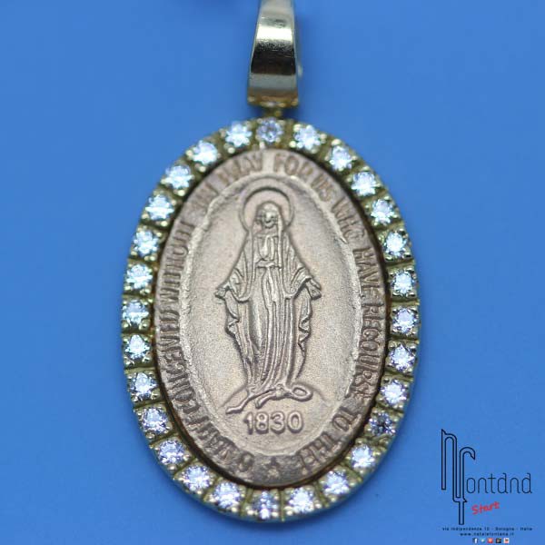 Ciondolo in oro giallo ovale con rappresentazione della Madonna delle Grazie.