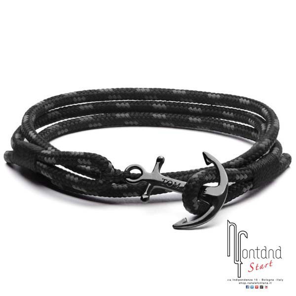 TOM HOPE BRACCIALE "TRIPLE BLACK" - ANCORA SILVER E PVD IN PLATINO NERO, CORDINO DOPPIO GIRO NERO, RIFINITURE IN COTONE NERO